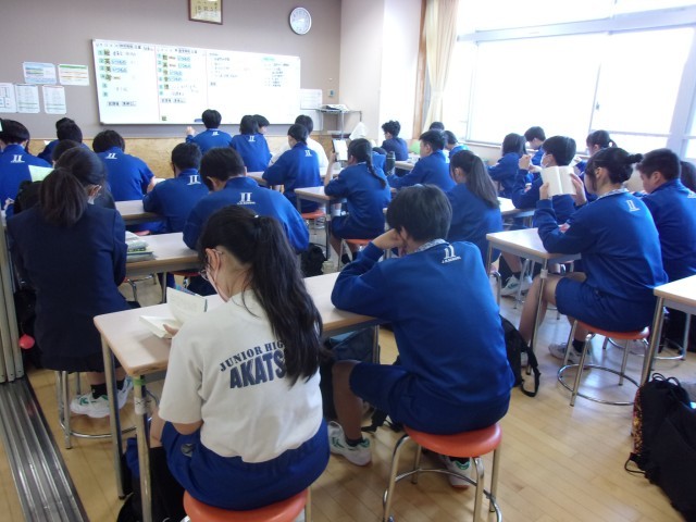 赤二中では、全学年朝の8時15分から20分間、読書を行っています。