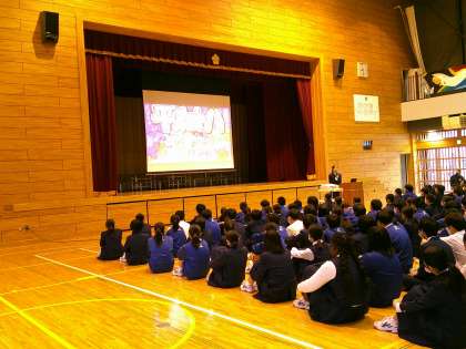 見やすくわかりやすいスライドを使った発表で、聴いている生徒も熱心に耳を傾け、平和とは何かについて考えていました。