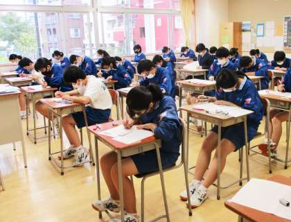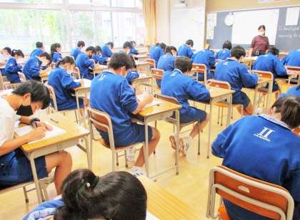 国語、英語、理科の順に考査が行われています。写真は英語のリスニング問題が終わり、筆記の問題に取り組んでいるものです。どの生徒も真剣のそのものです。さすが9年生!