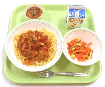 スパゲティペスカトーレ キャロットサラダ ブルーベリーケーキ 牛乳