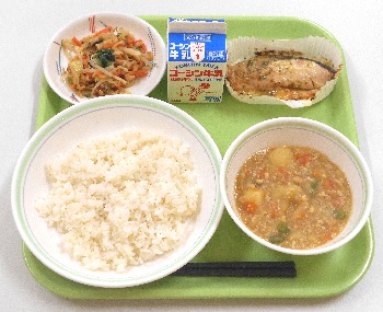 ご飯 秋鮭の黄金焼き じゃが芋のそぼろ煮 野菜のピーナッツあえ 牛乳