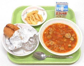 今日はアメリカの料理を紹介します。アメリカは様々な国から持ち込まれた食文化が入り交じっています。「ホットドッグ」はドイツから。手を汚さずに熱いソーセージを食べるため、パンにはさんだといわれています。「フレンチフライ」はアメリカでのフライドポテトの呼び方です。「マンハッタンチャウダー」とはトマトをベースにした味が特徴のスープです。