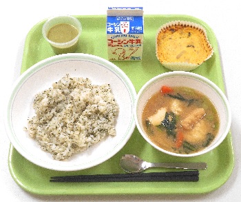 かおりごはん きのこの卵焼き めだいのつみれ汁 抹茶ムース 牛乳