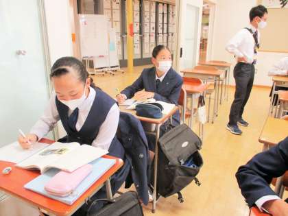一方、面談を待つ9年生も時間を惜しむように待合室で学習に取り組んでいます。時間を気にしながらも少しの時間も無駄にしないようにしている姿に感心させられました。