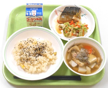 栗ご飯 鯖の味噌煮 けんちん汁 キャベツの甘酢和え 牛乳
