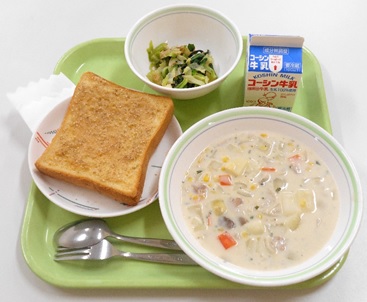 ねりごまトースト ビーンズチャウダー 小松菜とツナのサラダ 牛乳