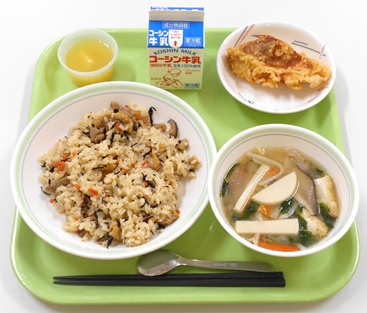 今日の給食は、成増小・成増ヶ丘小・赤二中3校合同の学びのエリア給食です。今月は、郷土料理にしようということになり、沖縄料理を取り入れることにしました。「クワジューシー」は沖縄風炊き込みご飯。「クワ」は硬い、「ジューシー」は雑炊という意味です。「イナムドゥチ」は具沢山味噌汁。「イノシシもどき」という意味で、イノシシの肉の代わりに豚肉を使っている料理です。デザートには、沖縄県産のパイナップル缶を入れたゼリー。国産パイナップルを使うのは少し贅沢なのですが、少量なので味わって食べてください。