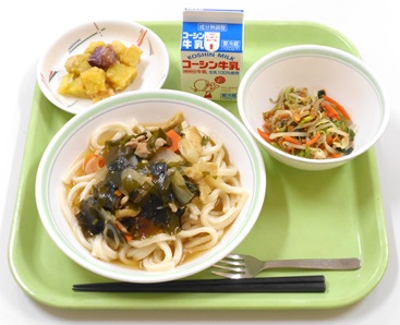 わかめうどん じゃこごまあえ アーモンドキャラメルポテト 牛乳