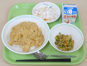 玉葱【北海道】 キャベツ【茨城県】 小松菜【埼玉県】 人参【千葉県】 鶏肉・鶏卵【青森県】 切り干し大根【宮崎県】 油揚げ【大豆:カナダ】 アーモンド【アメリカ】 黄桃缶【ギリシャ】