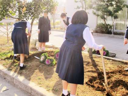 期末考査の疲れも見せず、校庭の花壇を耕し、水をまいて、汗をかきながら真剣に、そして楽しそうに、葉牡丹を植えていました。