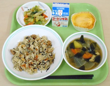 大豆入りひじきご飯 だし巻き卵風 さつまいもの味噌汁 甘酢和え 牛乳