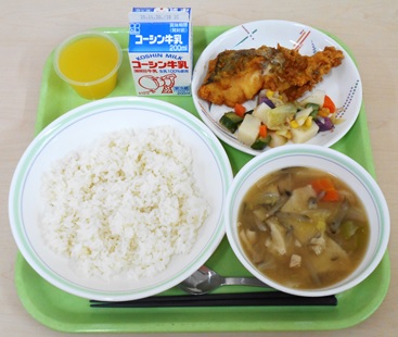 ご飯 ホキの紅葉揚げ サイコロサラダ せんべい汁 ラッキースターマンゴーゼリー 牛乳