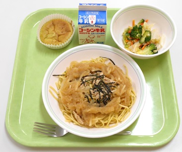 おろしスパゲティ ビーンズサラダ 明日葉チーズケーキ 牛乳