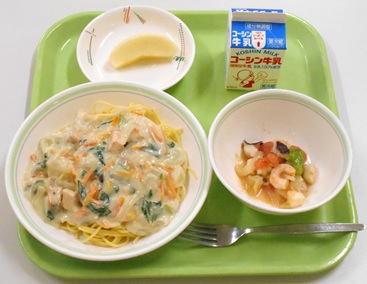 鮭と小松菜のクリームパスタ シーフードレモンマリネ りんご 牛乳