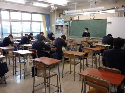 9年生私立高校一般入試 公開日 2022/02/10 更新日 2022/02/10 学校の様子 2月10日(木) 9年生は私立高校一般入試の日です。朝から雪が心配されましたが、弱い雨やみぞれで大きな混乱はなく試験会場に向かえているようです。学校は、すでに推薦で進路が決まっている生徒や都立のみを受検する生徒が登校している状況で、クラスによってはかなり人数が少なかったです。授業は問題演習を行っているクラスや、和歌の学習を兼ねて静かに百人一首を行っているクラスがありました。