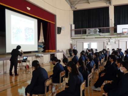 今日は土曜授業日です。7年生は3校時に体育館に集まってボランティアワークショップのガイダンスを行いました。ボランティアワークショップは高島平地域で1980年代から続く、中学生にボランティア活動に参加してもらおうという取組です。新河岸児童館が窓口となって、高島平まつりや高島平福祉園のお祭り、特別支援学校の夏祭りなどのボランティアを募集して、活動させています。本校の先輩たちも今までたくさん参加してきました。今年度は感染症拡大でイベント自体が中止となっていて、ボランティアを行う機会がありませんが、中学校在学中に一度はかかわってもらいたいということでガイダンスを行いました。みんなよく説明を聞いていました。募集があったときには、ぜひ参加してみてください。