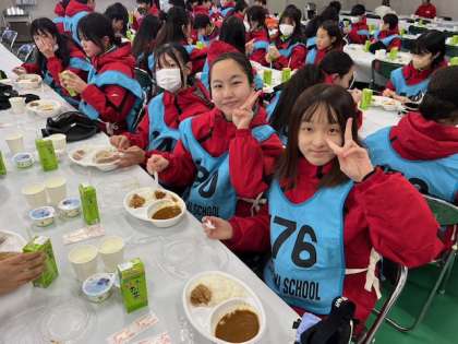 スキー場でのお昼ごはんは、隣接するスポーツセンターへ移動し、メニューは定番カレーライスです。