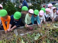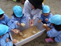 どんぐり拾いに行きました。どんぐりを見つけては、次々に拾う子どもたちです。自然の中でしかできない経験をしっかりと楽しんでいます。拾ったどんぐりを見せ合って、嬉しそうな姿も見られました。