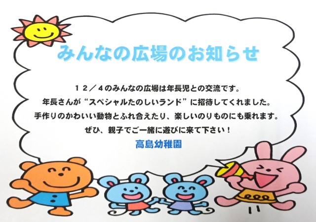 高島高校のお兄さんお姉さんと遊んだり、降園時の活動を見てもらったりしました。お兄さんやお姉さんが来てくださることに、子どもたちは大喜びです。生徒の皆さんにとっては、大切な学びとなる交流です。子どもたち...