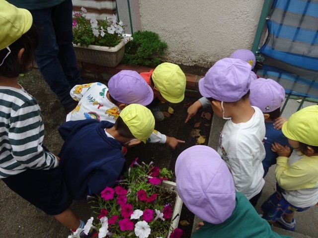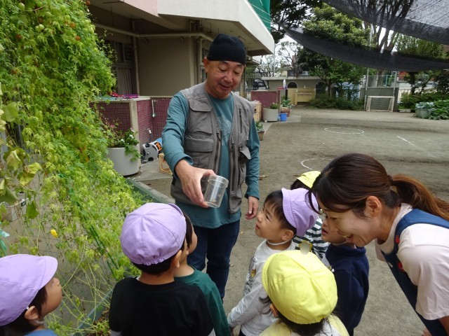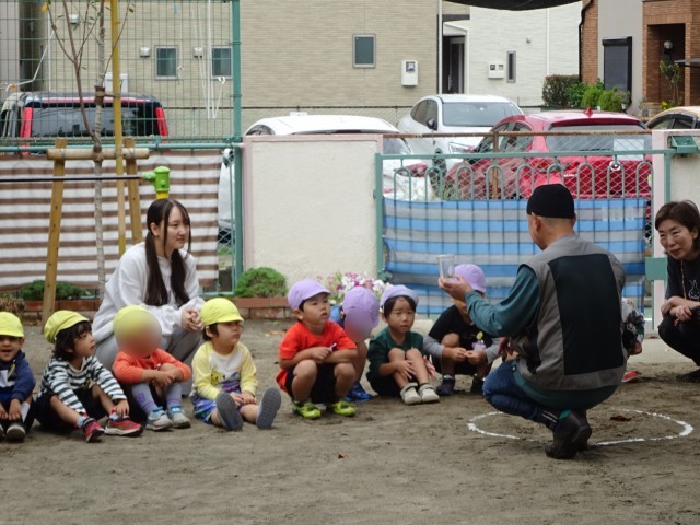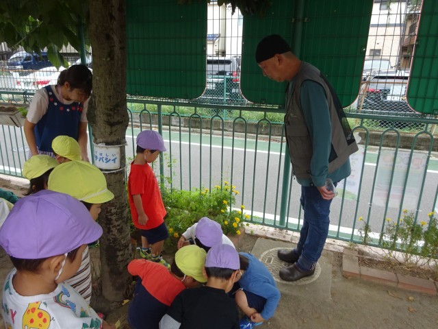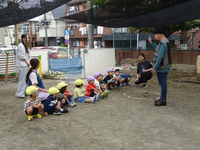 佐々木隊長の方を見ながら話を聞いている年少さん。虫を見つけることが楽しくなってきました。不思議だなぁ、と思う気持ちが育ってきています。