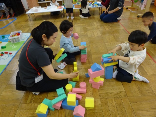 おうちのひとと離れるのは、少しドキドキするけれど、楽しい遊びを見つけて楽しみを見いだしている子どもたちです。