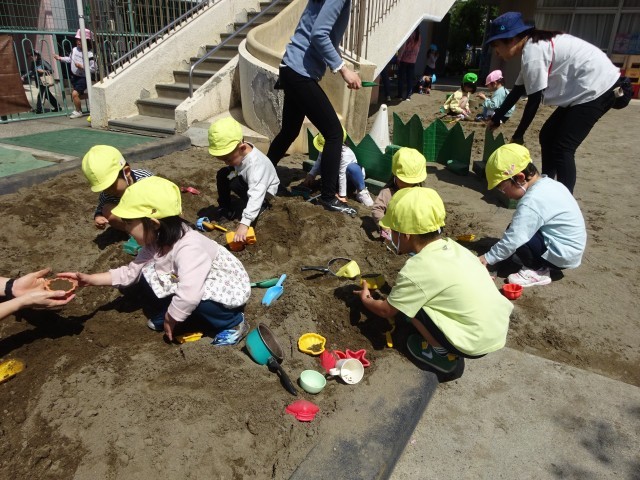 保育室で遊んだ後、園庭に出て砂場での遊びを楽しみました。