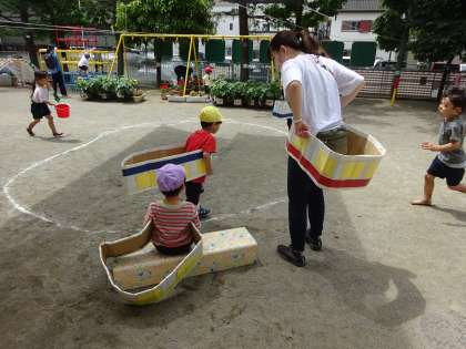 段ボールで作った電車で、出発!