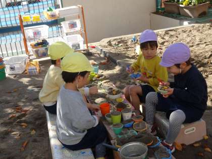 砂を上にのせて、シャベルをぐるぐる回しています!