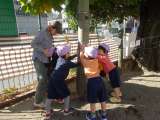 園庭でのごっこ遊び。 近くにあるビールケースやついたてを持ってきて、 子どもたち...