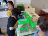 年長組保育室の飼育コーナー 毎朝登園すると 子どもたちが飼育ケースをのぞき 世...