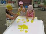 指につける絵の具を使って、 フィンガーペインティング! 気持ちいい〜!! 黄色...
